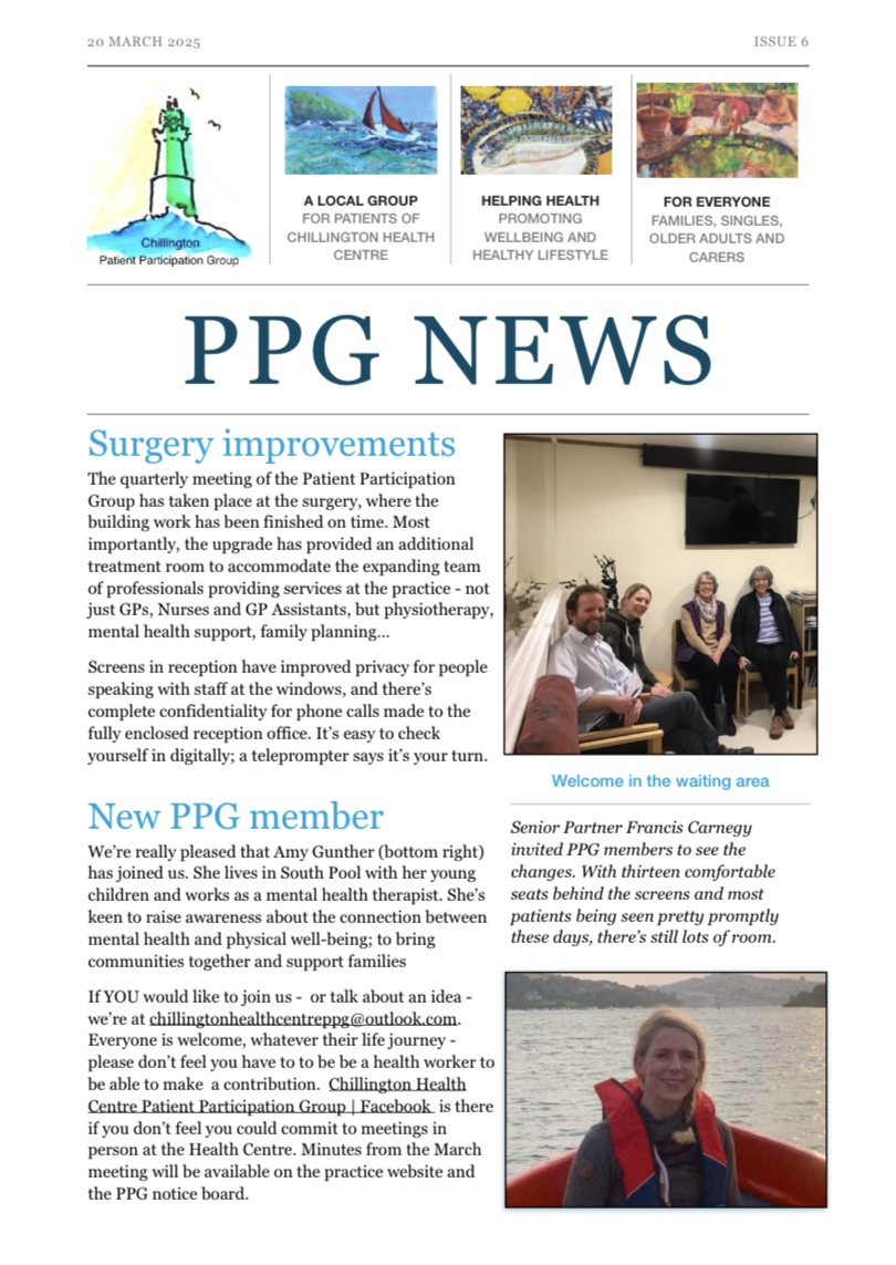 Chillington Health Centre patient participation group (PPG) are volunteers who meet quarterly with the practice manager and one of the doctors – usually the senior partner, Francis Carnegy. The group discusses the services available, and how changes can be made for the benefit of patients and the practice.